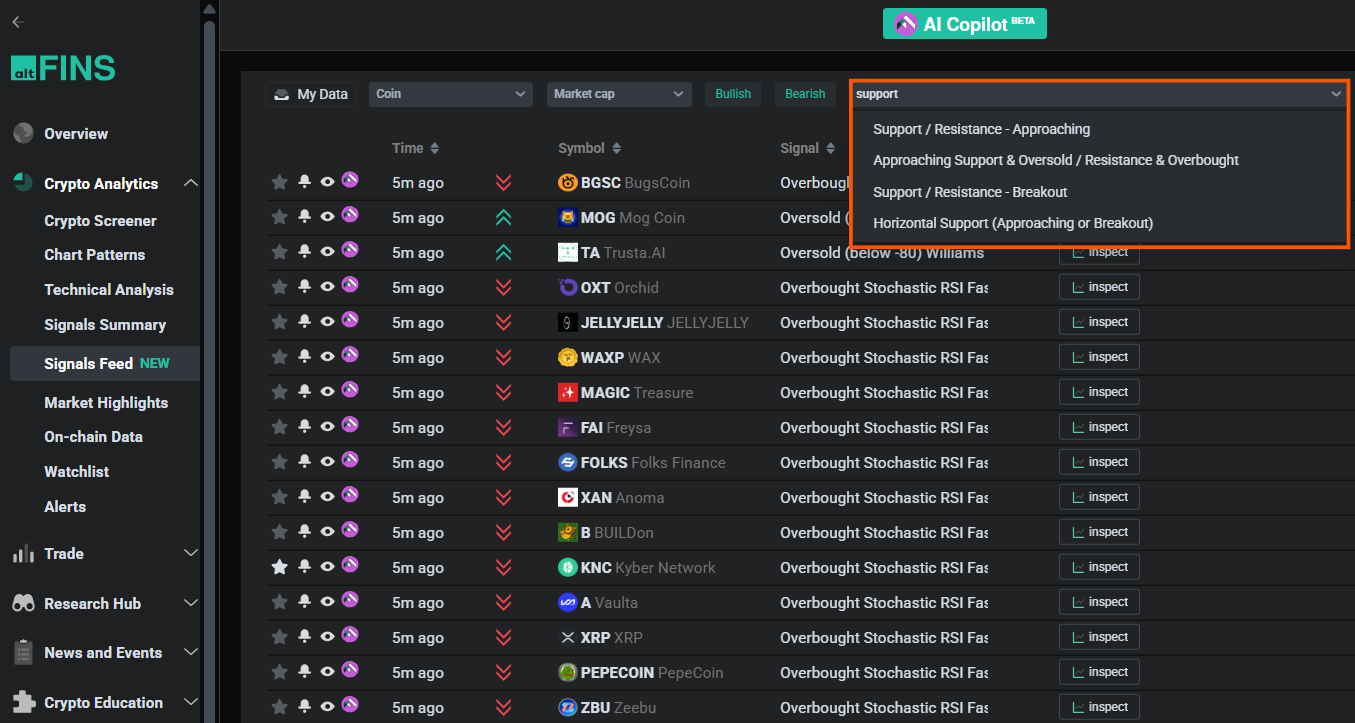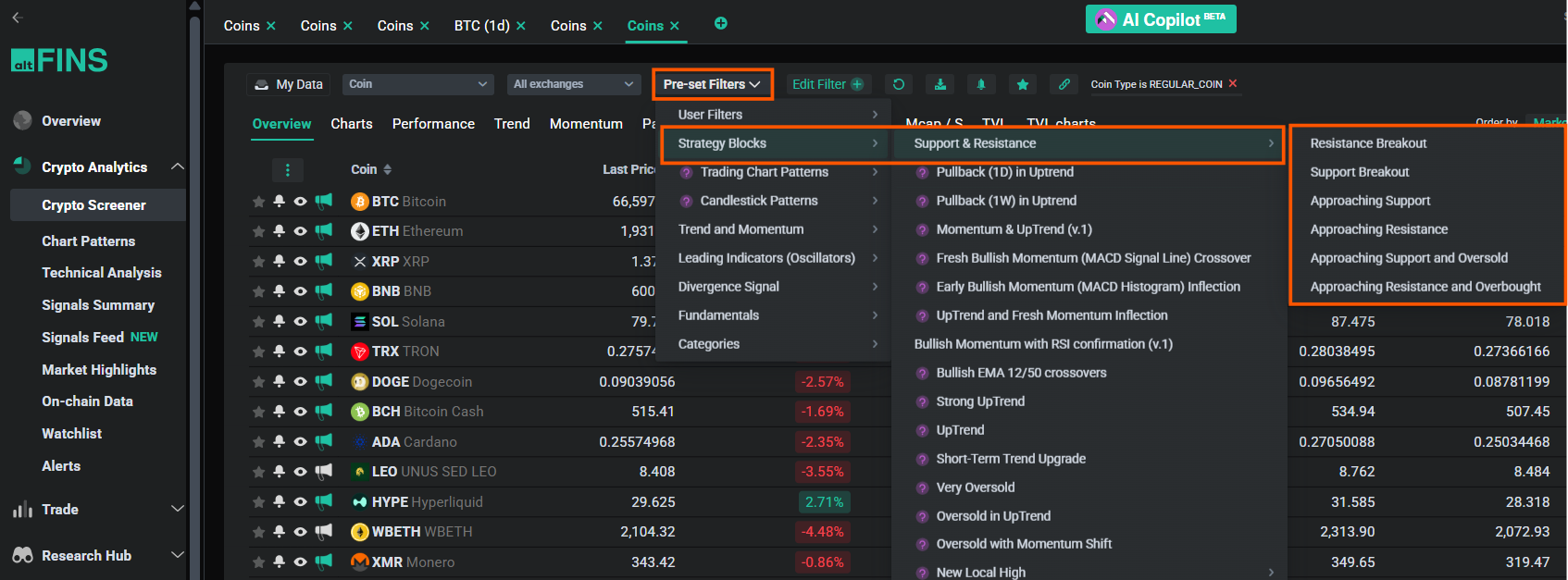 With automated Support & Resistance detection and new preset scans, altFINS helps traders: