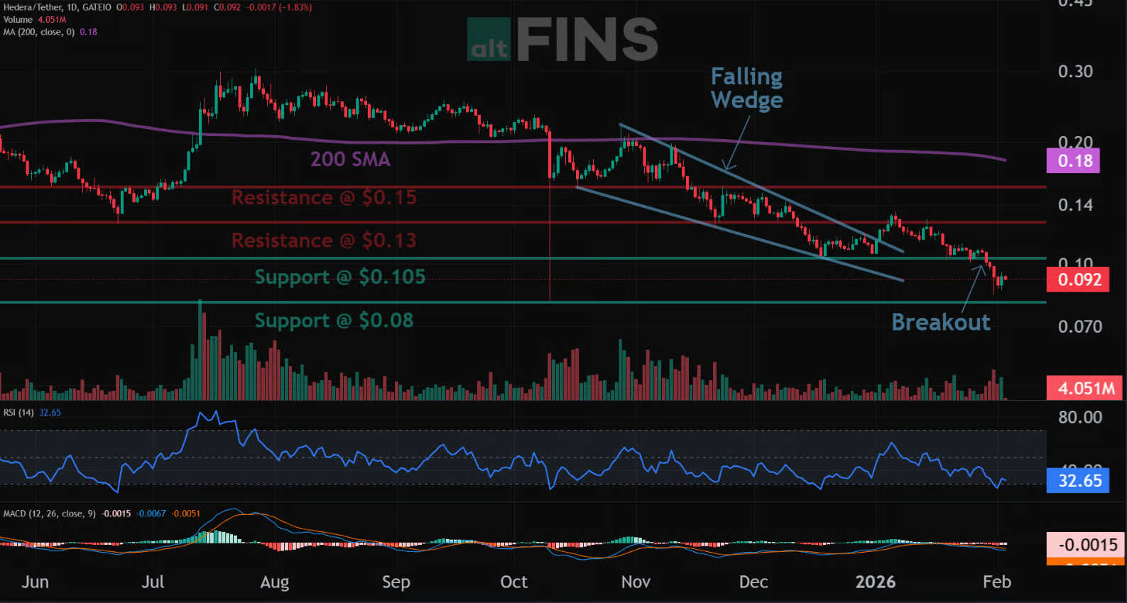 Setup 1: Hedera (HBAR) — Break Below $0.105 → Target $0.08