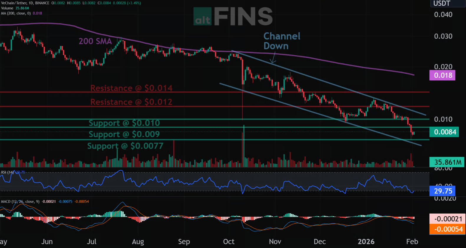 Setup 3: VeChain (VET) — Break Below $0.009 → Target $0.0077 (52W Low)