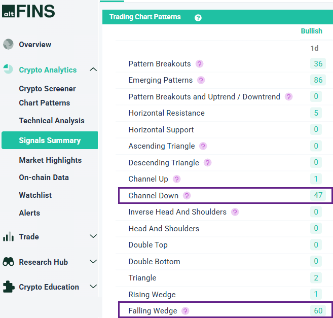 1) Chart Patterns (search for Channel Down and Falling Wedge pattern types)