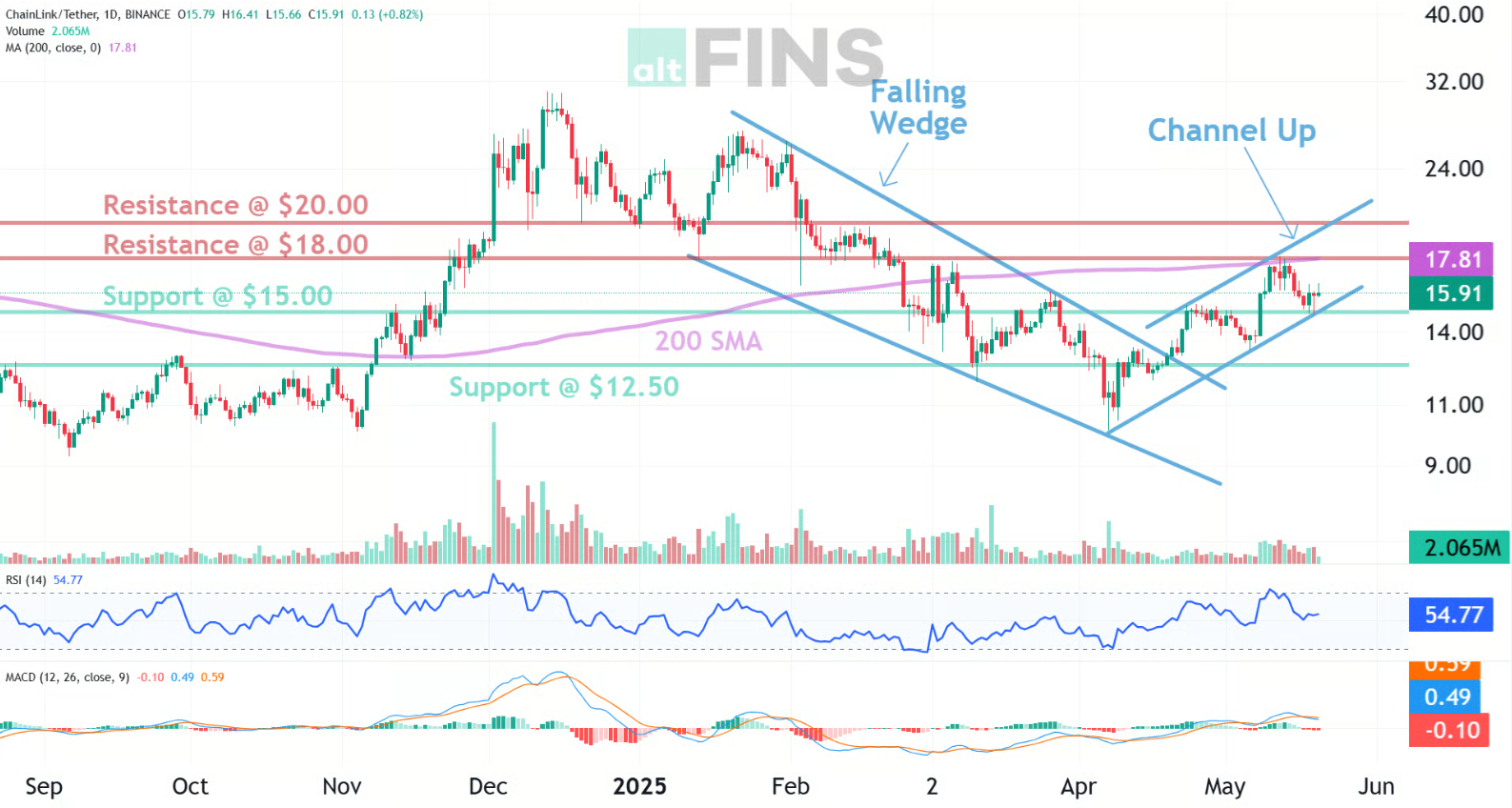 In addition to automated chart patterns, altFINS’ analysts conduct technical chart analyses of top 50 cryptocurrencies. We call these Curated Charts and they evaluate 5 core principals of technical analysis: Trend, Momentum, Patterns, Volume, Support and Resistance. Read technical analysis of ChainLink below.