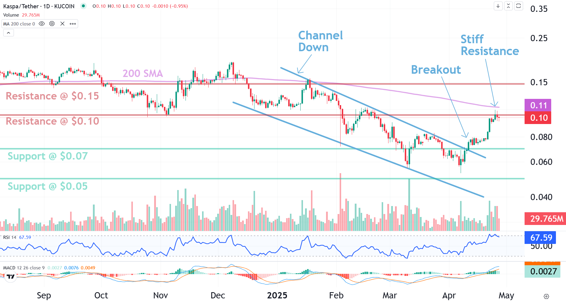 That $0.10 is a stiff resistance area because it also lines up with 200-dat Moving Average (200 SMA), which also acts as resistance.