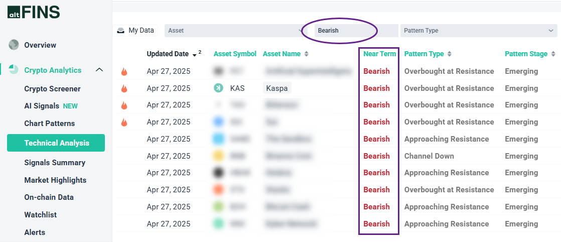 altFINS Technical Analysis section also shows coins that are “Approaching Resistance” or are “Overbought at Resistance”.
