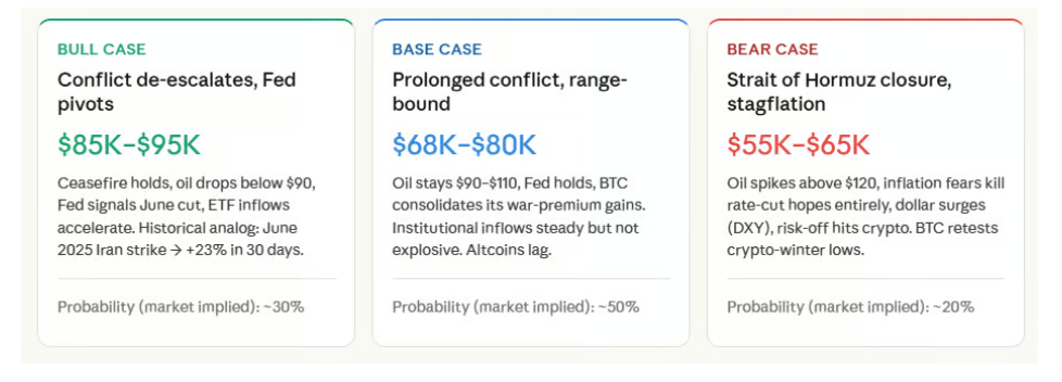 The base case ($68K–$80K range) reflects a prolonged conflict at current intensity: BTC holds its war premium but doesn't break out.
