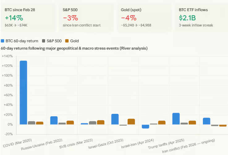 An analysis tracking 60-day returns across seven major geopolitical events shows Bitcoin delivering positive returns in every single instance, averaging approximately 18%, versus roughly 3% for the S&P 500 and 4% for gold. Gold recorded negative 60-day returns twice; the S&P did too; Bitcoin's worst print was a +3% during the carry-trade unwind — still positive.