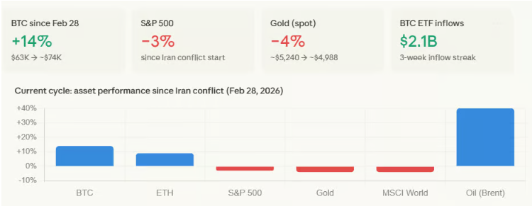 That's a genuinely unusual configuration. Historically, oil shocks and gold have moved together as safe havens; this time BTC is decoupling from gold while oil surges, which is the inverse of what you'd expect.