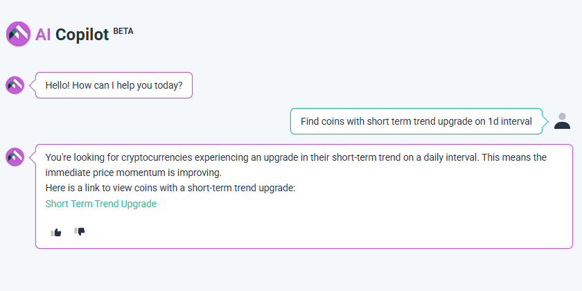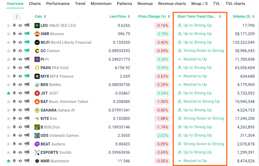 With this analytic, traders can also find coins when their trend rating changes (i.e. upgrade or downgrade).