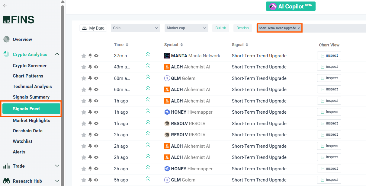 A simple way to spot early trend reversals is by using altFINS’ automated trend ratings and pre-set market scans.