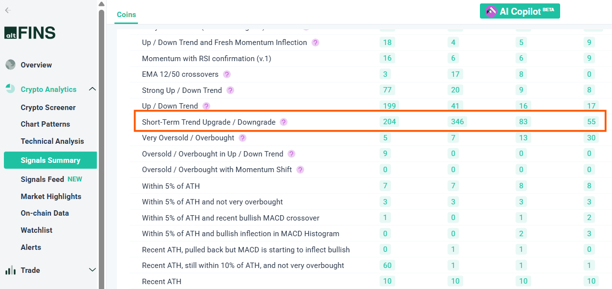 altFINS automatically rates crypto trends across Short-, Medium-, and Long-term horizons using a 5-level system (Strong Up → Strong Down). Traders can spot opportunities by tracking trend upgrades/downgrades, such as assets recently improving from Neutral → Up. In Downtrends—when most coins trade below the 200-day MA—traders often short bounces, but altFINS also helps identify early trend reversals with Short-term trend improvements. Use pre-set scans, custom filters, alerts, and the AI Copilot to quickly find actionable trade setups.