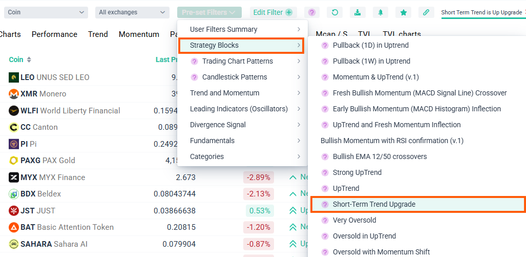 So let’s find assets where Short-Term trend has recently changed to Up or Strong Up (see live results here):