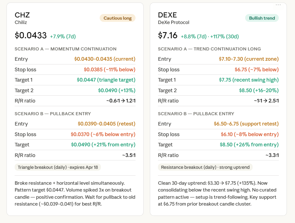 The altFINS pattern engine flagged a confirmed triangle breakout (daily, expires Apr 18) with a price target of $0.0447, and a simultaneous horizontal resistance breakout. The breakout candle had ~3x normal volume which is a good confirmation sign. The problem is that entering right now at $0.0433 gives a poor R/R on Scenario A. Scenario B (waiting for a retest of the old resistance around $0.039โ0.041) is the cleaner trade if you’re patient.