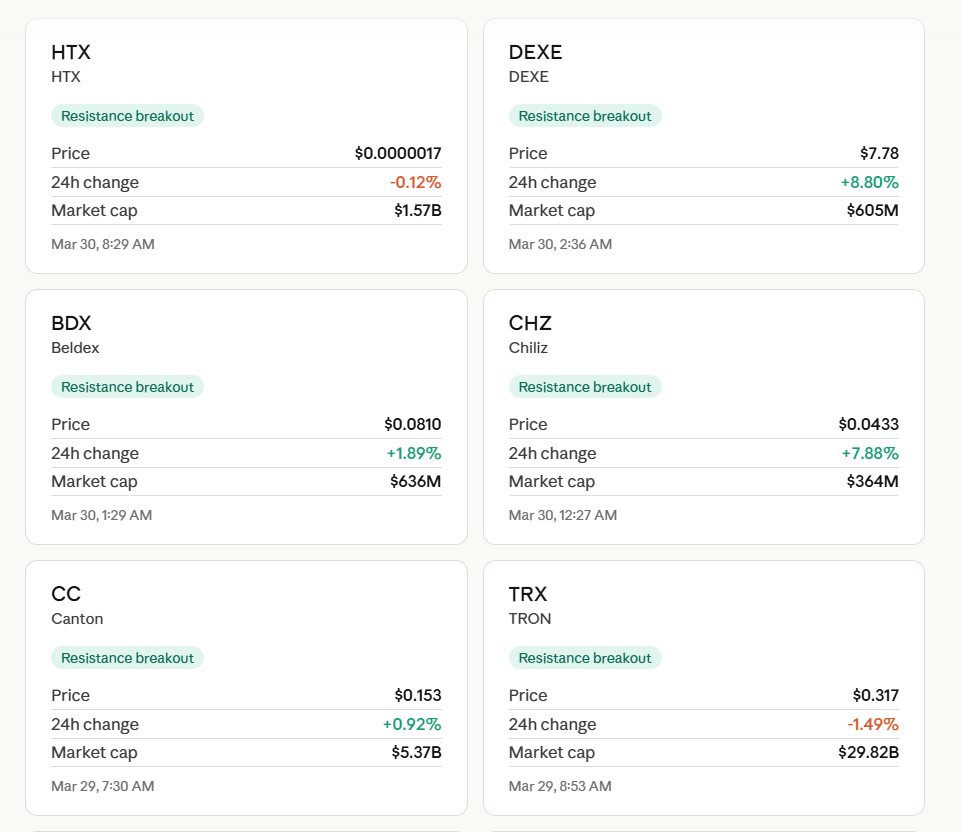 - TRX (TRON) โ $29.8B mcap, breakout signal Mar 29 (though -1.5% since)