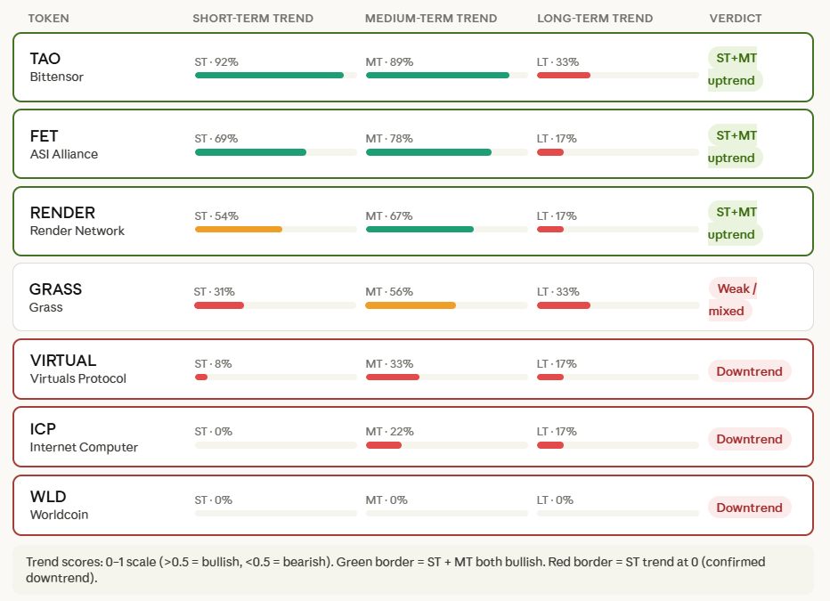 FET is the second-cleanest โ ST 69%, MT 78%. Both timeframes are solidly bullish, and with the resistance breakout signal from March 25 layered on top, this is the most complete setup in the AI basket for a trend-following long.