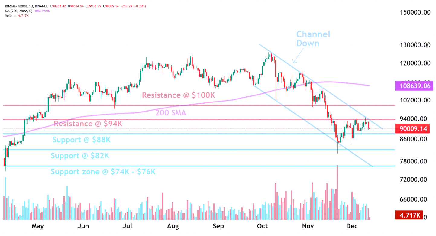 On the downside, Bitcoin found support at $90K, where buying pressure was strong enough to prevent further decline. If this support fails, the next major support zone lies around $75K, which could act as a strong demand area. The market is currently moving within a sideways channel between $90K and $108K, indicating consolidation. The 200 SMA at around $78.5K serves as an additional support reference, which could act as a swing entry point if the price dips.