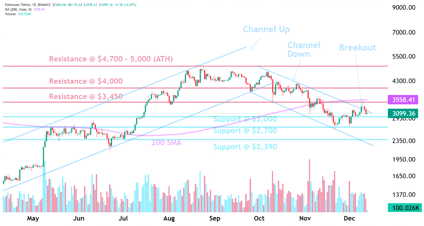 And ETH got rejected at horizontal resistance and 200 Day Moving Average (also resistance).